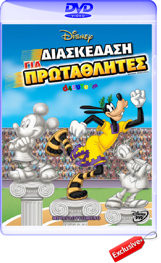 Disney. Στην πρώτη θέση, ο Πρωταθλητής των Ολυμπιακών Αγώνων, ο Γκούφι προσπαθεί για το χρυσό σε μια σειρά από αθλήματα και τελικά κερδίζει ατέλειωτα γέλια. Ο Μίκυ μαθαίνει γκολφ, αλλά ένας σκανταλιάρης βοηθός του κρύβει το μπαλάκι του γκολφ καταστρέφοντας το παιχνίδι του. Ο Γκούφι σώζει ένα πρωτάθλημα ποδοσφαίρου, καθώς κακοί κλέφτες προσπαθούν να κλέψουν το πολύτιμο κύπελλο που αξίζει εκατομμύρια. Γυμναστείτε μαζί με τον Γκούφι κάνοντας body building, κυρίως στους μυς που βοηθάνε στο γέλιο!