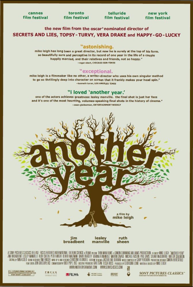 Ενα ευτυχισμενο ηλικιωμενο ζευγαρι, ο ανυπαντρος γιος τους, μια μοναχικη φιλη του. Αναμεσα σε μια γεννηση κι ενα θανατο, ακομη ενας χρονος θα περασει γεματος με χαρες και λυπες. Υπότιτλοι: Ελληνικοί Special feature: Greek subtitles Γλώσσα: Αγγλικά Παραγωγή: 2010 Είδος Ταινίας: Κωμωδία, Δράμα Σκηνοθέτης: Mike Leigh Ηθοποιοί: Jim Broadbent, Ruth Sheen, Lesley Manville