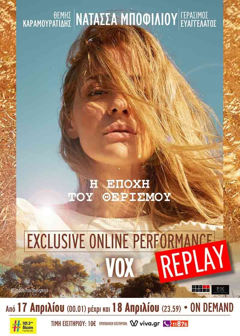 Mια μεγάλη οπτικοακουστική παραγωγή ειδικά σχεδιασμένη για livestream. Η Νατάσσα Μποφίλιου, ο Θέμης Καραμουρατίδης και ο Γεράσιμος Ευαγγελάτος παρουσιάζουν για πρώτη φορά την «Εποχή του Θερισμού». Μία μεγάλη οπτικοακουστική παραγωγή ειδικά σχεδιασμένη για livestream, από τη σκηνή του Vox.